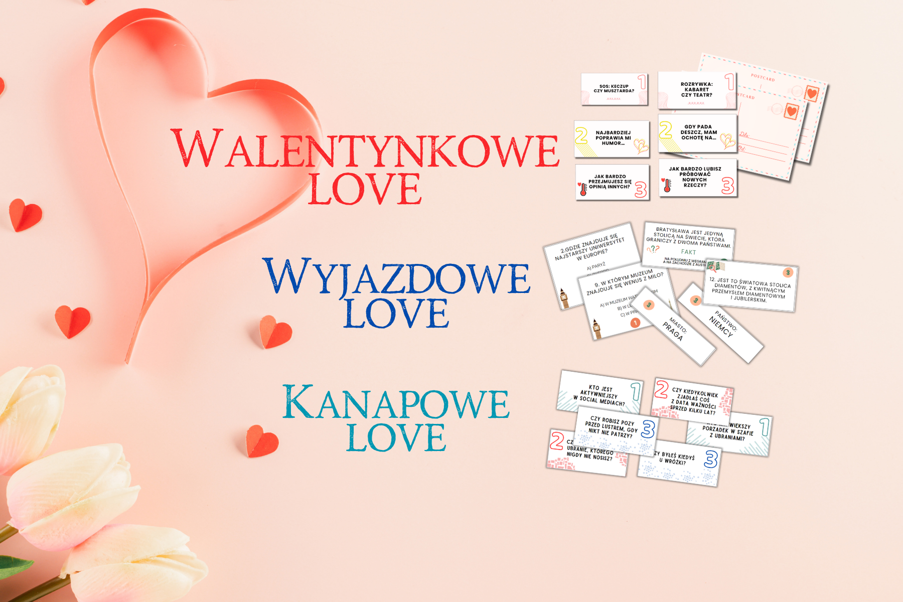 Zestaw Walentynkowe Love + Kanapowe Love + Wyjazdowe Love to trzy gry dla par, które chcą czegoś innego niż kolejny odcinek serialu czy scrollowanie obok siebie. To gotowy sposób na wspólną zabawę: trochę rozmów, trochę śmiechu, trochę wspomnień i takich momentów, kiedy patrzycie na siebie i myślicie: „kurczę, ale my się dobrze znamy.
