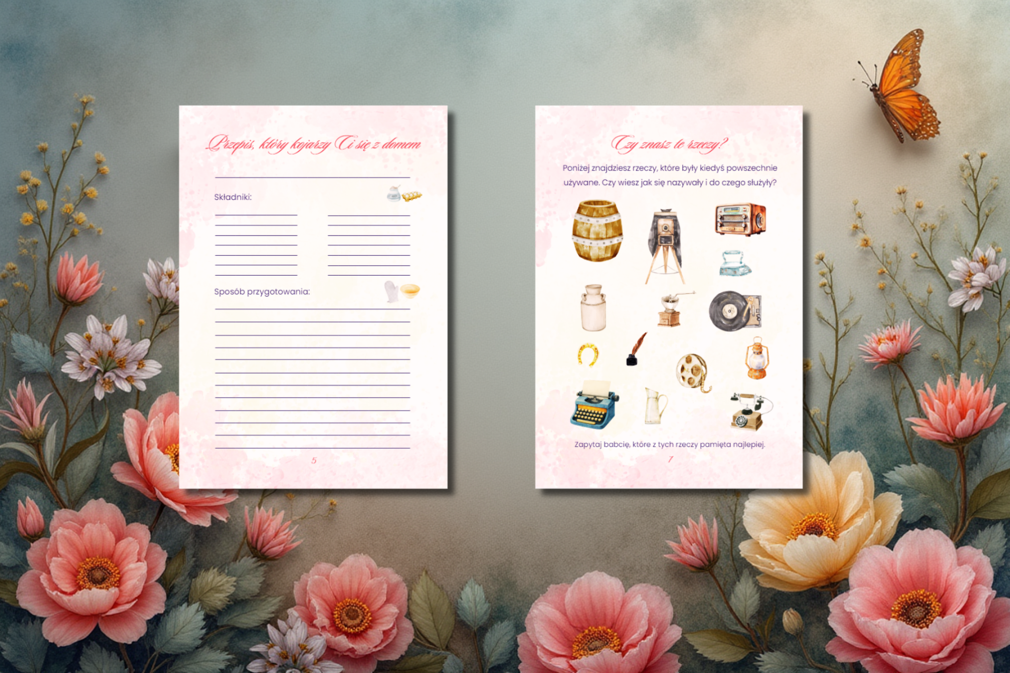 Rodzaj treści: pytania o dzieciństwo, rodzinę, codzienne życie i wartości, miejsca na zapiski, wspomnienia i refleksje, mini zadania i proste porównania babcia–wnuk