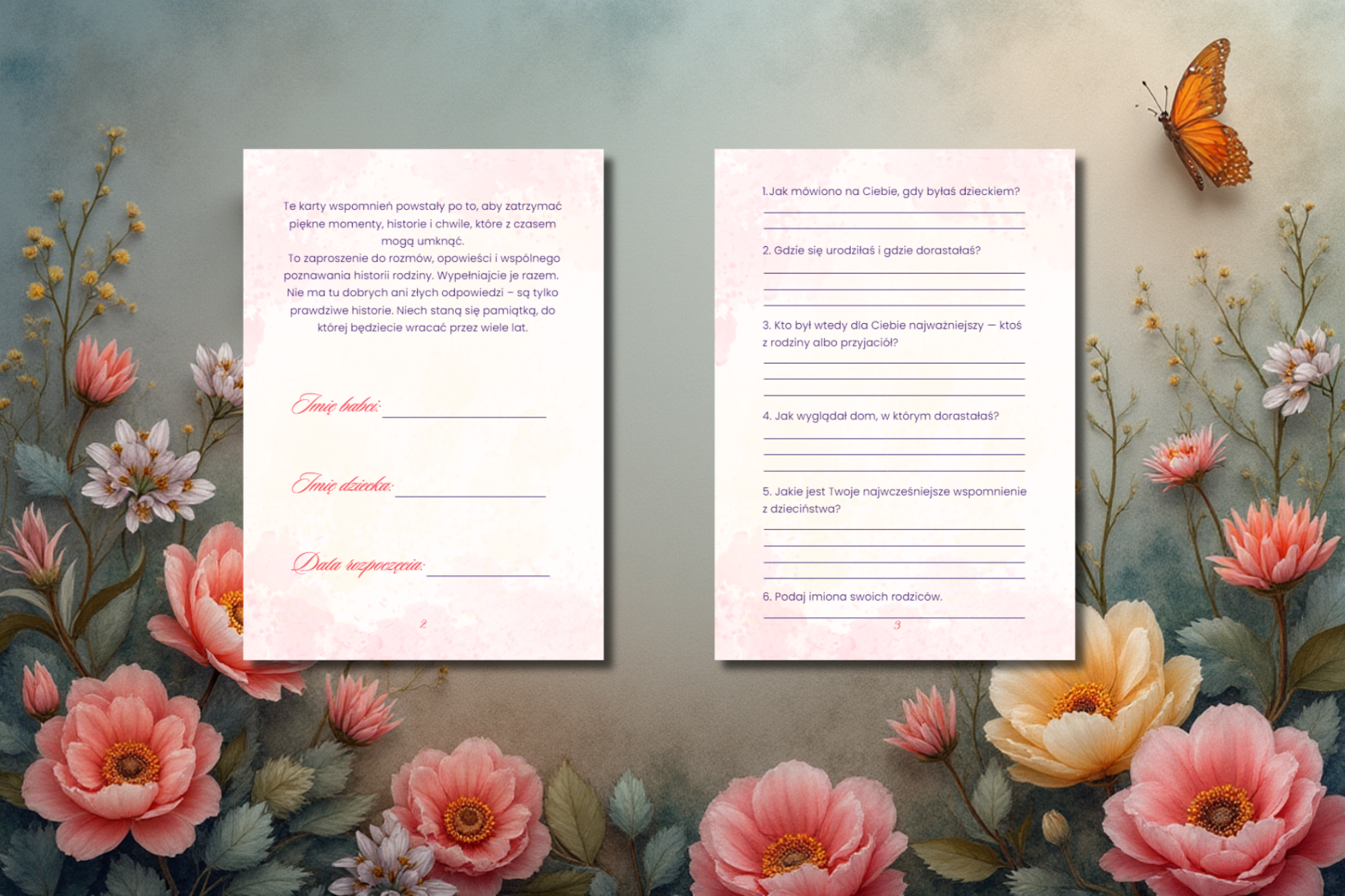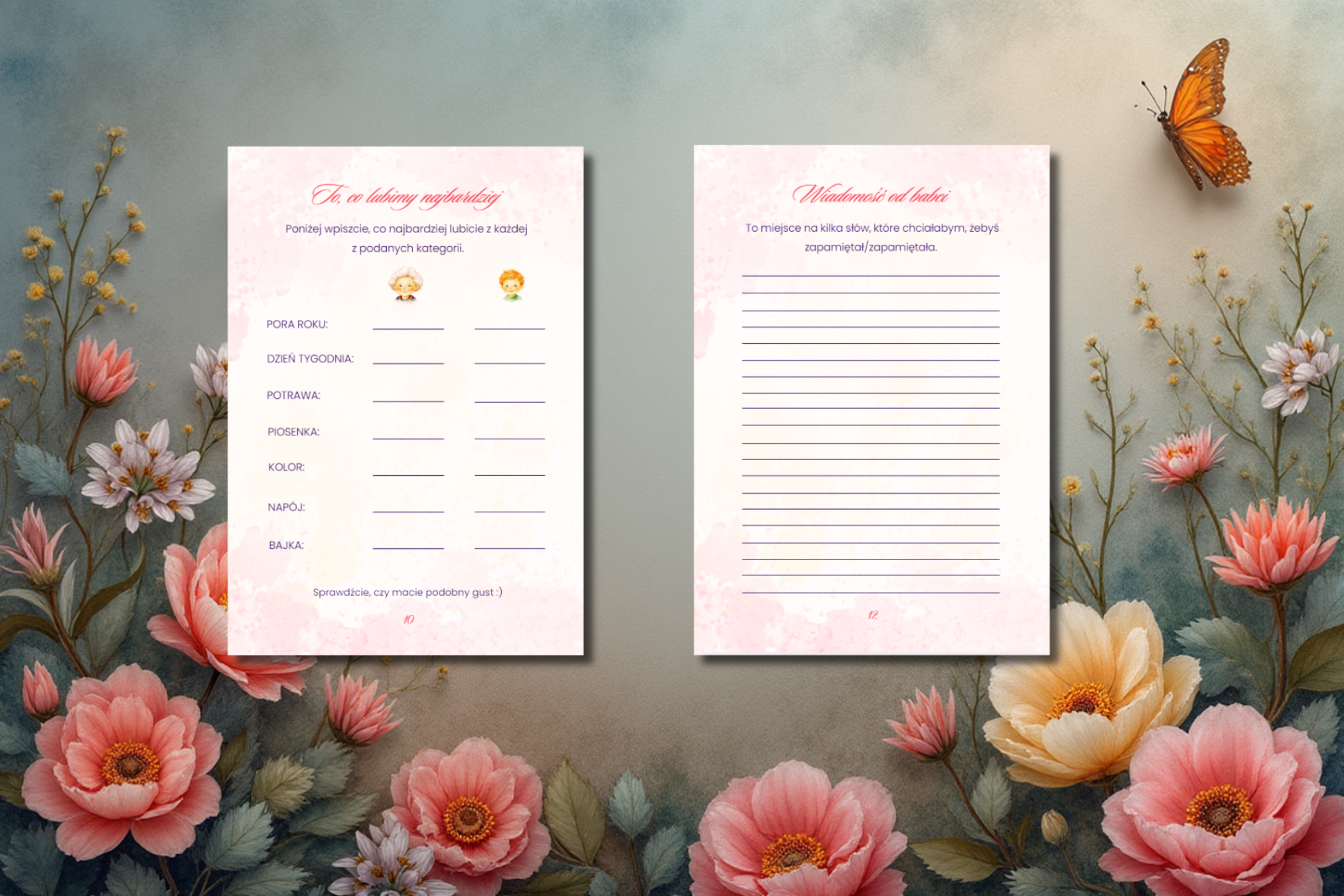 - 12 pięknie zaprojektowanych kart wspomnień do wspólnego wypełniania