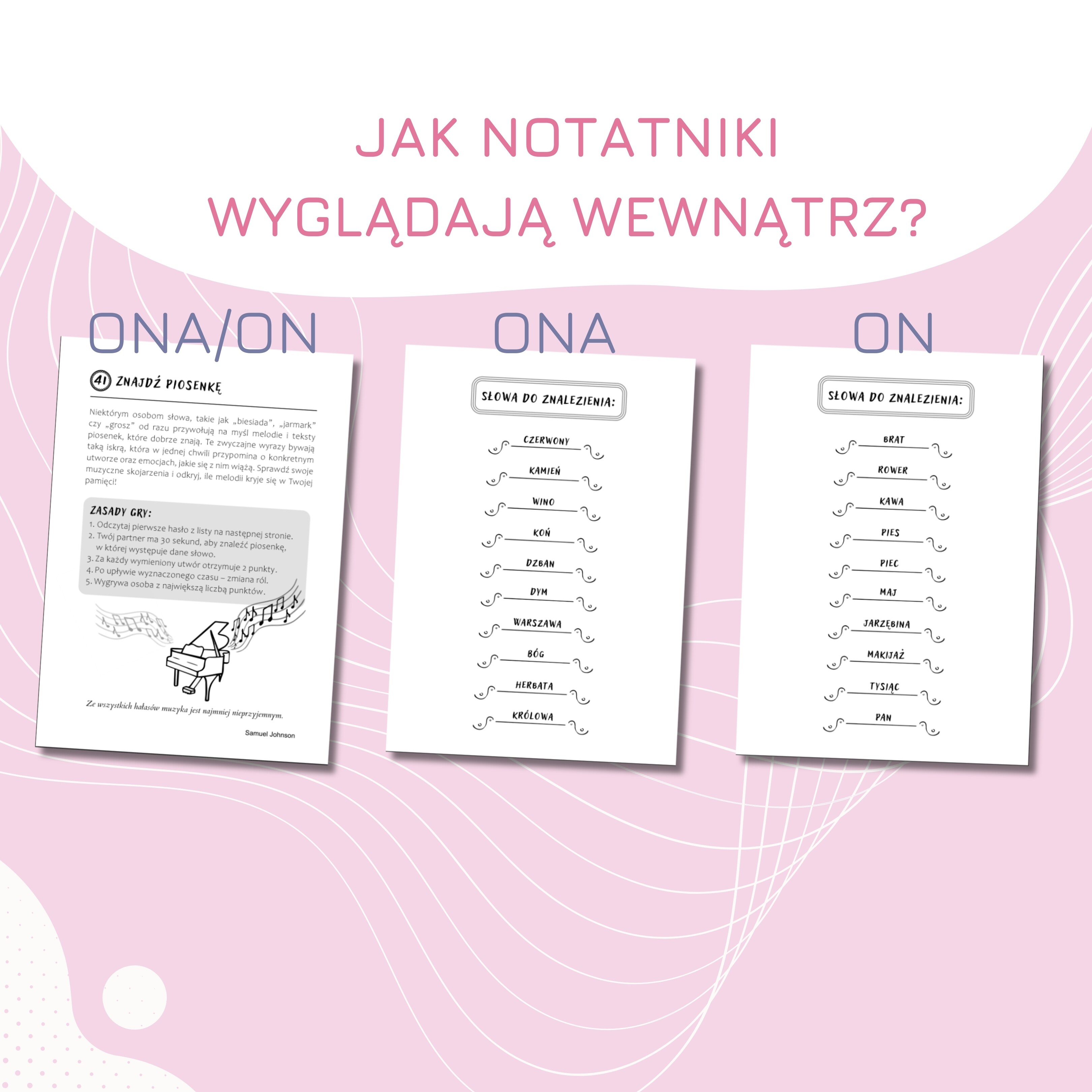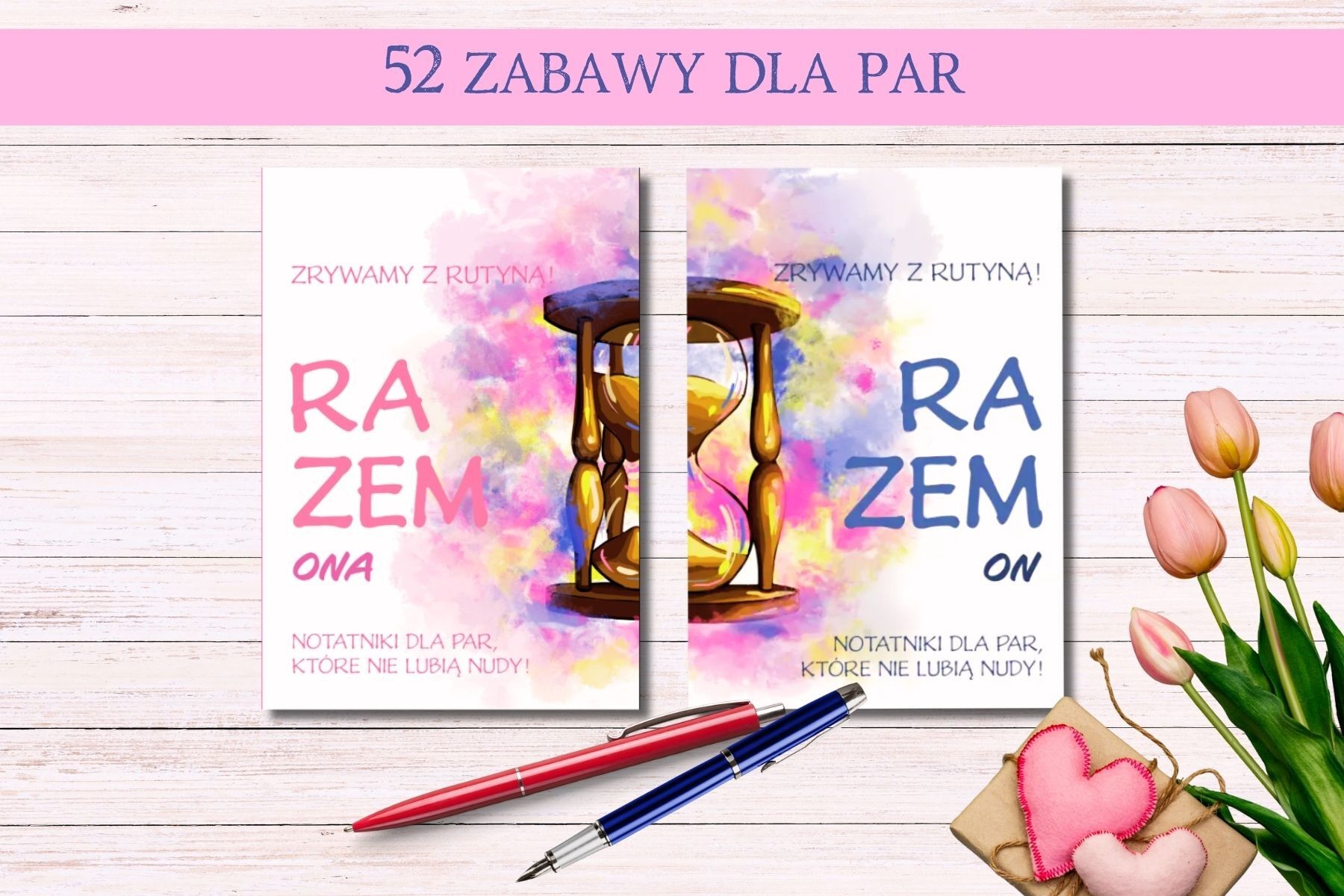 Zestaw zawiera dwa notatniki. W każdym z notatników znajdują się 52 zadania, przedstawione z dwóch perspektyw.