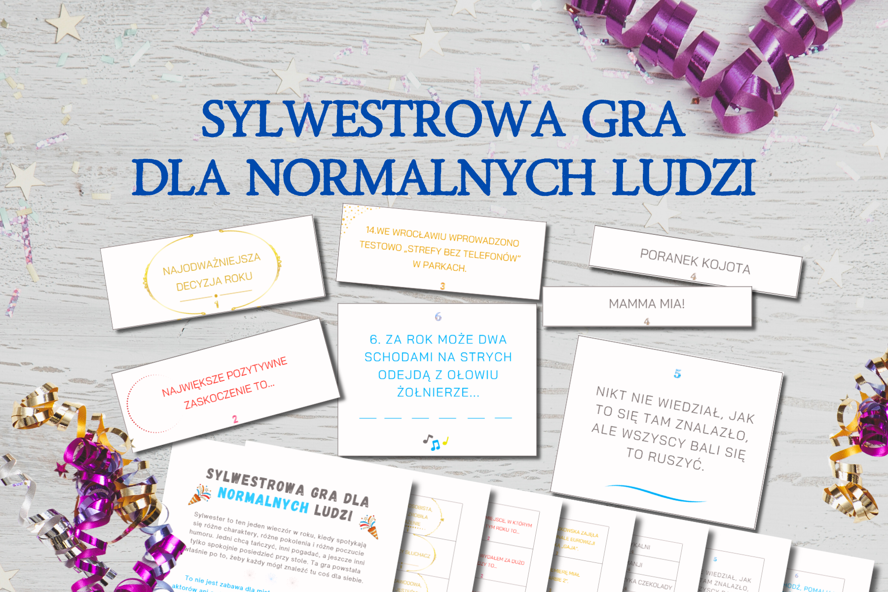 Nie potrzebujesz żadnych wielkich przygotowań ani dodatkowych akcesoriów. Drukujesz, wycinasz rozkładasz karty i zaczynacie grać. Reszta dzieje się sama. Dodaj do koszyka i miej gotowy plan na Sylwestra.