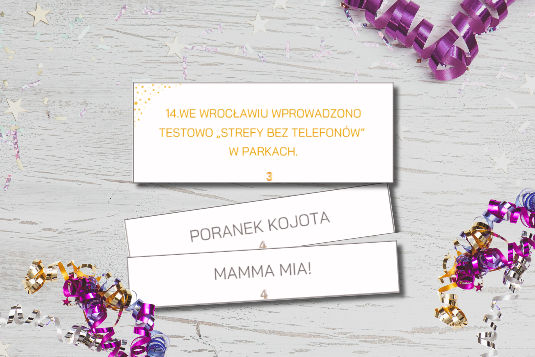 Sylwestrowa gra dla normalnych ludzi to gotowy sposób, żeby rozkręcić wieczór, połączyć wszystkich przy stole i stworzyć wesołe wspomnienia. Bez stresu i niezręcznych momentów. Po prostu dobra zabawa.