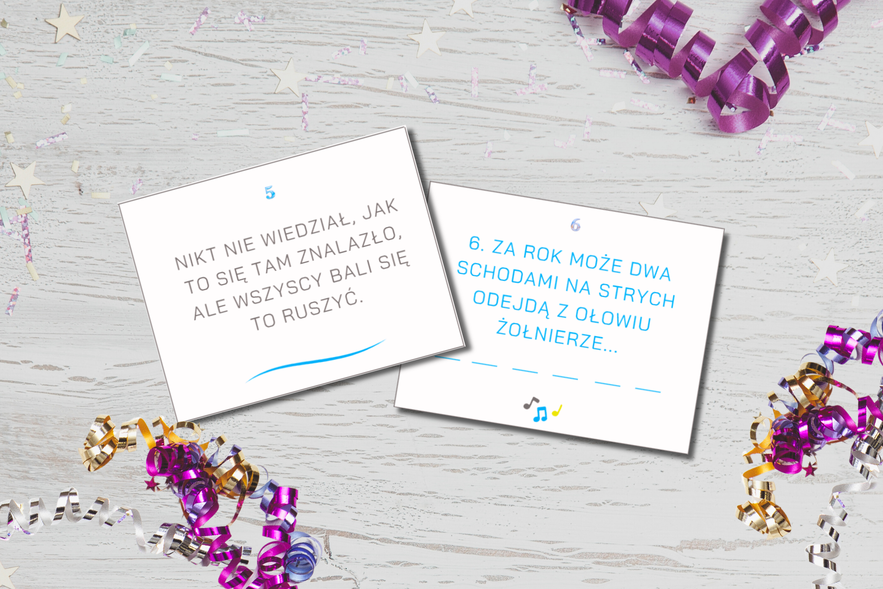 W środku znajdziesz kilkadziesiąt kart. Rundy są urozmaicone: lekkie pytania, zabawy słowne, kalambury, a także muzyczne wyzwania, które wciągają zarówno tych rozmownych, jak i tych, którzy zwykle wolą posiedzieć z boku. Każda karta to pretekst do śmiechu i rozmowy.
